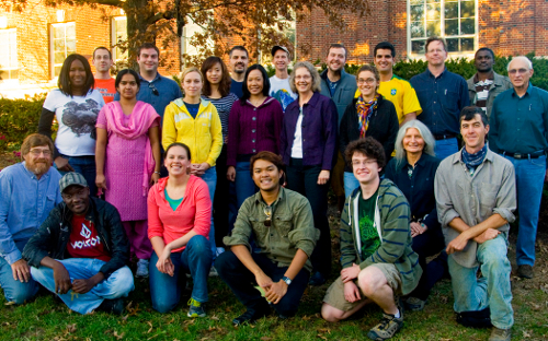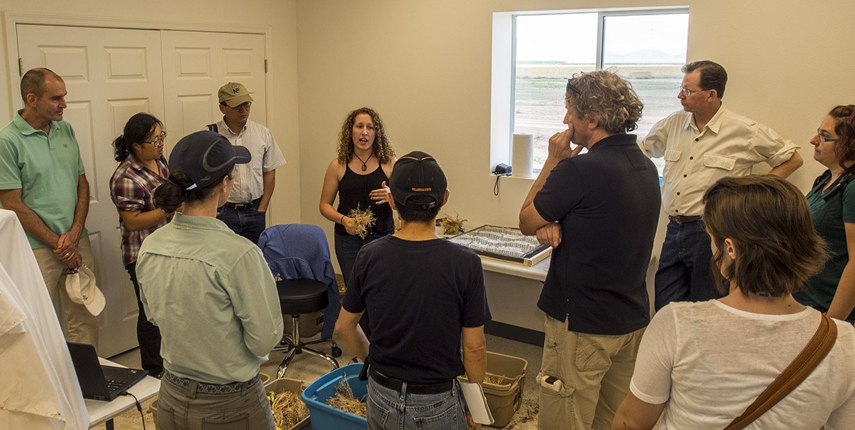 Stephanie Klein explains to members of the visiting Nobel Foundation about her research and root sampling methods.
